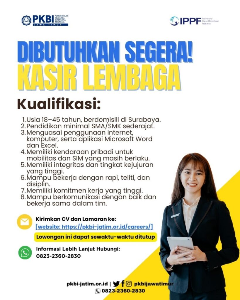 Kualifikasi yang dibutuhkan PKBI Jawa Timur membuka kesempatan bagi profesional yang kompeten untuk bergabung sebagai Kasir Lembaga. Posisi ini bertanggung jawab dalam pengelolaan transaksi keuangan harian lembaga, termasuk penerimaan dan...