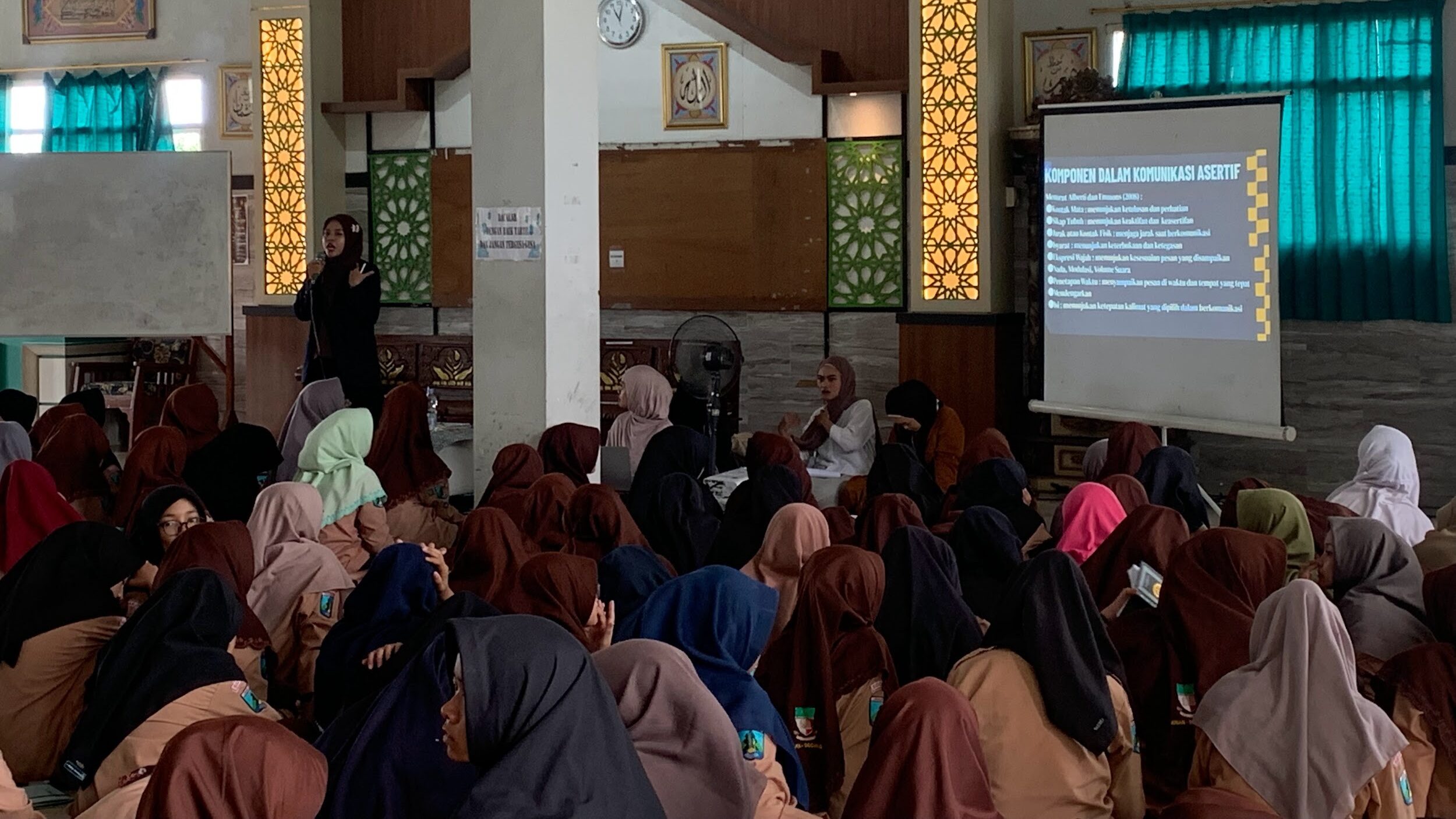Beberapa santri kemudian secara sukarela membagikan pengalaman mereka mulai dari diejek, disuruh melakukan hal yang tidak nyaman, hingga didorong oleh teman sebayanya. Ruangan menjadi tempat yang aman bagi mereka untuk berbagi dan didengar. Melanjutkan sesi, Silva memperkenalkan konsep komunikasi asertif sebagai cara sehat untuk menjaga diri. Ia menjelaskan bahwa setiap santri berhak menyampaikan penolakan, keberatan, atau pendapat tanpa rasa takut. Komunikasi asertif bukan hanya tentang berbicara dengan sopan, tetapi juga tentang menghargai diri sendiri dan orang lain. Santri belajar bahwa mengatakan “tidak” bukanlah sikap buruk, melainkan bentuk keberanian untuk menjaga batasan diri.